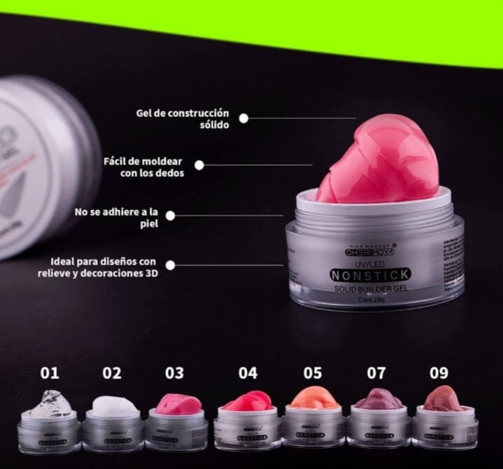 Nonstick-Gel 3D, es un gel uv-led para construcción de uñas, su polimerización es controlada, el nonstick puede ser moldeado hasta que se seque bajo luz uv led por 60 segundos, este gel es 100% solido lo cual permite esculpir y realizar estructuras de una forma rápida y eficaz. la duración de este gel es de 15 a 21 días.